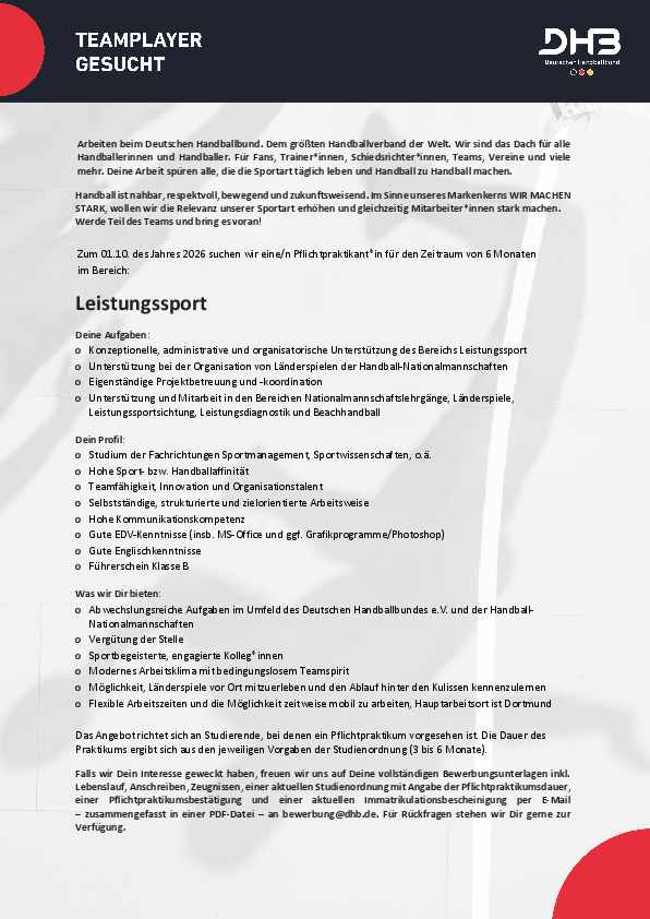 o Abwechslungsreiche Aufgaben im Umfeld des Deutschen Handballbundes e.V. und der Handball-Nationalmannschaften