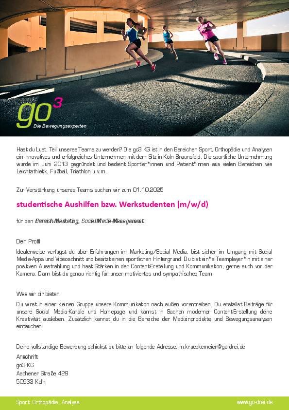 Die go3 KG ist in den Bereichen Sport, Orthopädie und Analysen ein innovatives und erfolgreiches Unternehmen mit dem Sitz in Köln Braunsfeld. Die sportliche Unternehmung wurde im Juni 2013 gegründet und bedient Sportler*innen und Patient*innen aus vielen Bereichen wie Leichtathletik, Fußball, Triathlon u.v.m.