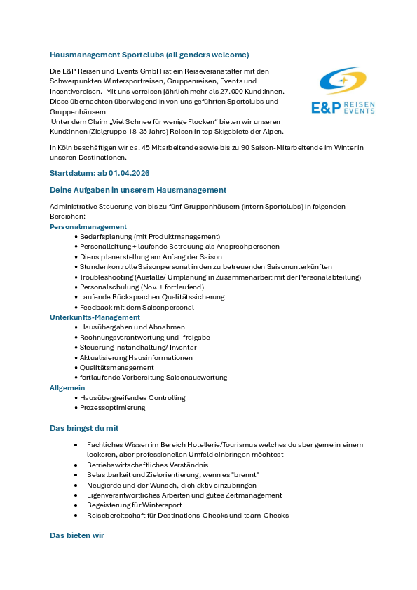 Für die o.g. Gruppenhäuser (intern „Sportclubs“) suchen wir ganzjährig eine:n Manager:in.