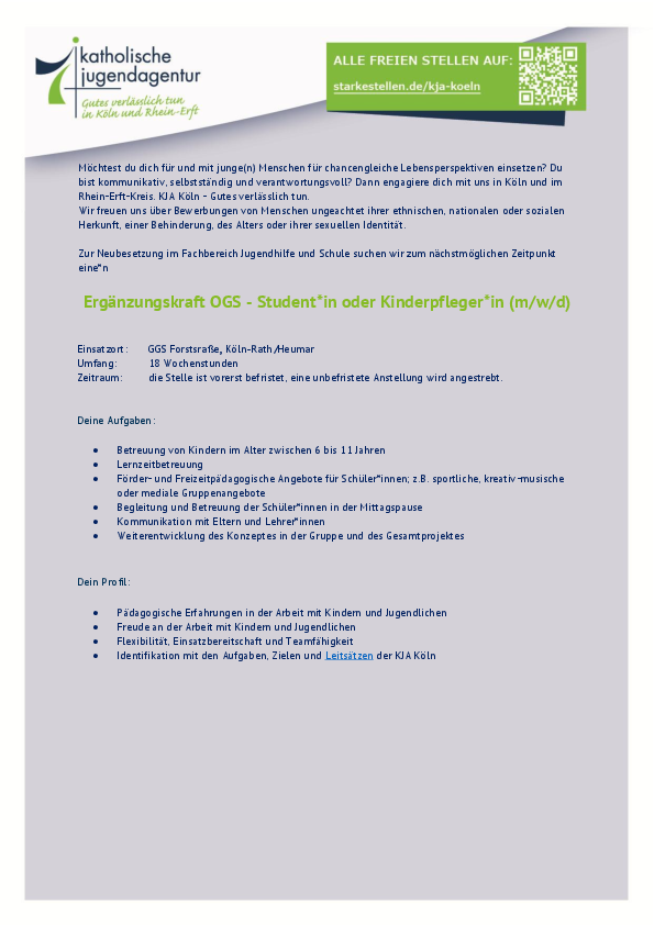 Möchtest du dich für und mit junge(n) Menschen für chancengleiche Lebensperspektiven einsetzen? Du bist kommunikativ, selbstständig und verantwortungsvoll? Dann engagiere dich mit uns in Köln und im Rhein-Erft-Kreis. KJA Köln - Gutes verlässlich tun.