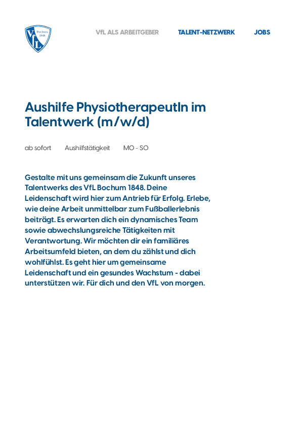 Spannender Job? Dann bewirb dich über unsere Karriereseite über jobs.vfl-bochum.de/stellenangebote/Aushilfe-PhysiotherapeutIn-im-Talentwerk-m-w-d-Bochum-VfL-Bochum-1848--974003601