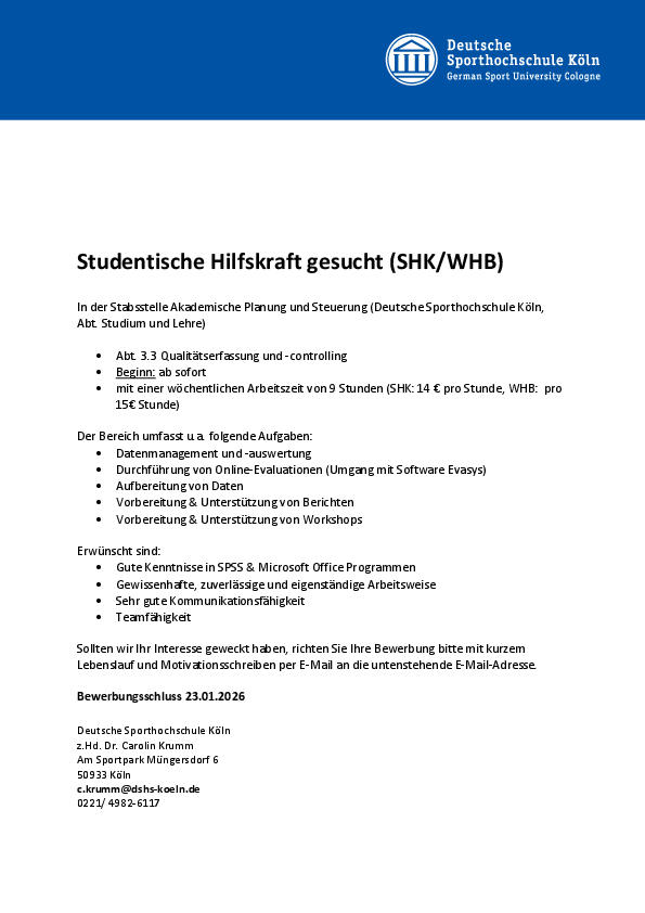 Studentische Hilfskraft gesucht in der Stabsstelle Akademische Planung und Steuerung (Deutsche Sporthochschule Köln, Abt. Studium und Lehre)
