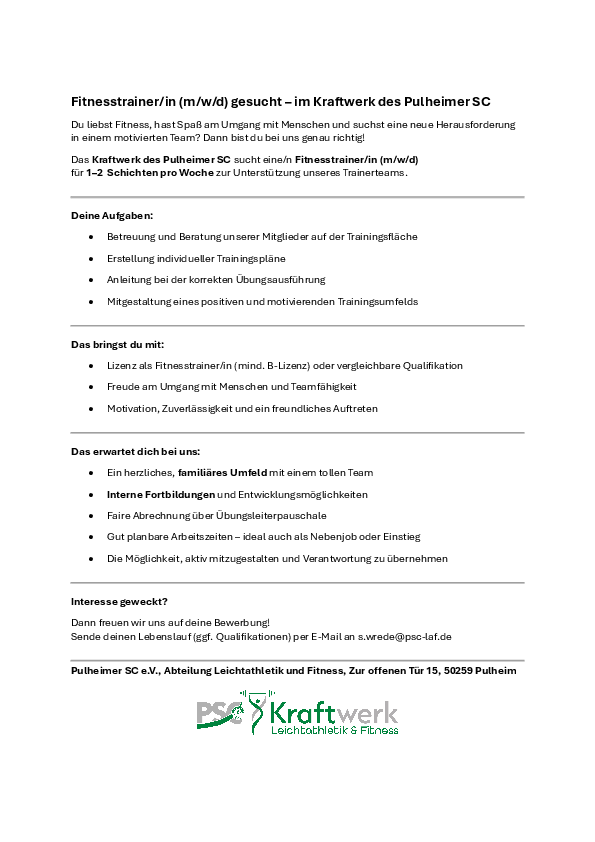 Das Kraftwerk des Pulheimer SC sucht eine/n Fitnesstrainer/in (m/w/d) für 1–2 Schichten pro Woche zur Unterstützung unseres Trainerteams.