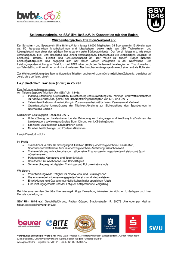 Zur Weiterentwicklung des Talentstützpunkts Triathlon suchen wir zum nächstmöglichen Zeitpunkt, zunächst auf