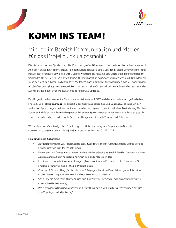 Minijob im Bereich Kommunikation und Medien für das Projekt ‚Inklusionsmobil‘
