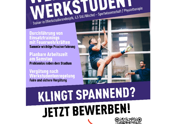 Du studierst Sportwissenschaft (oder ähnlichen Studiengang), machst eine Ausbildung in der Physiotherapie und hast Lust, dein Wissen praktisch anzuwenden? Dann unterstütze unser Team beim Training von Feuerwehr-Einsatzkräften und werde Teil eines spannenden, interdisziplinären Projekts.