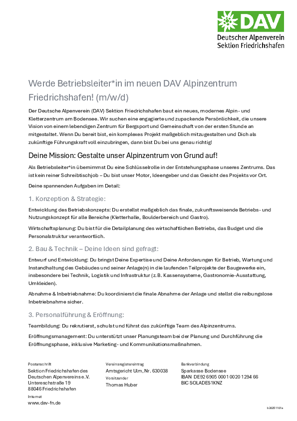 Der Deutsche Alpenverein (DAV) Sektion Friedrichshafen baut ein neues, modernes Alpin- und Kletterzentrum am Bodensee. Wir suchen eine engagierte und zupackende Persönlichkeit, die unsere Vision von einem lebendigen Zentrum für Bergsport und Gemeinschaft von der ersten Stunde an mitgestaltet. Wenn Du bereit bist, ein komplexes Projekt maßgeblich mitzugestalten und Dich als zukünftige Führungskraft voll einzubringen, dann bist Du bei uns genau richtig!
