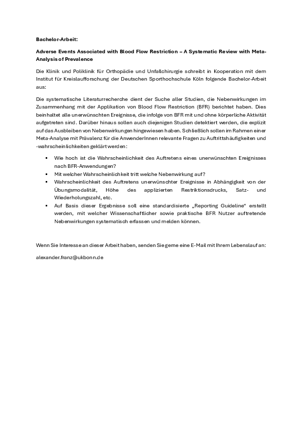 Die Klinik und Poliklinik für Orthopädie und Unfallchirurgie schreibt in Kooperation mit dem Institut für Kreislaufforschung der Deutschen Sporthochschule Köln folgende Bachelor-Arbeit aus:
