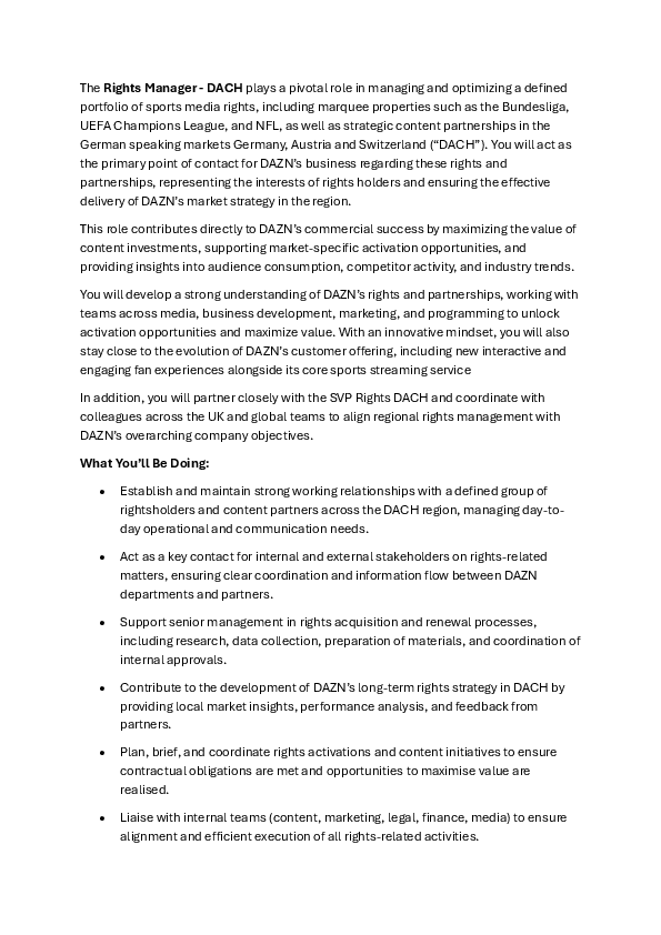 In addition, you will partner closely with the SVP Rights DACH and coordinate with colleagues across the UK and global teams to align regional rights management with DAZN’s overarching company objectives.