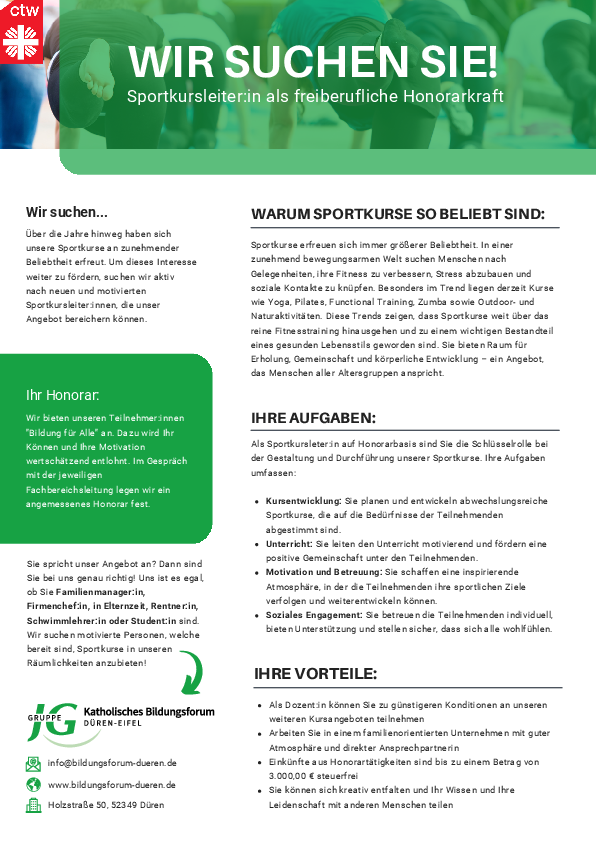 Haben sie vielleicht auch Interesse daran im Bereich Düren und Jülich mit einem Kursangebot zu starten? Auch hier haben wir sicherlich die Möglichkeit gemeinsam etwas passendes auf die Beine zu stellen.