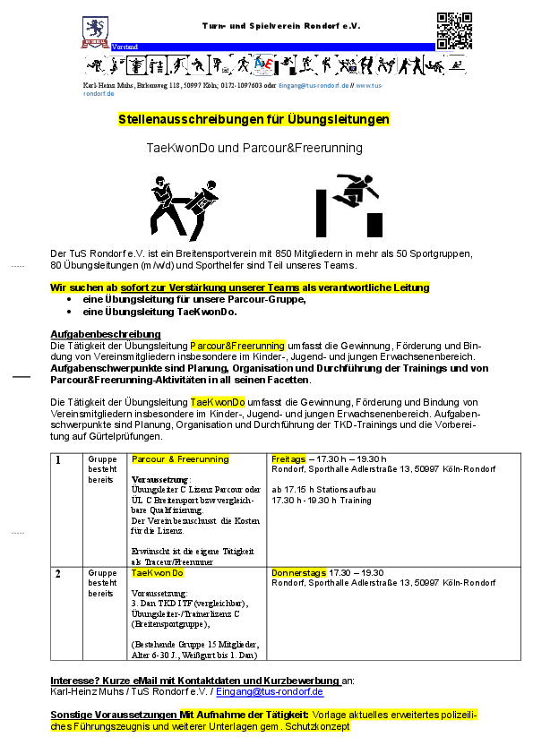 Die Tätigkeit der Übungsleitung TaeKwonDo umfasst die Gewinnung, Förderung und Bindung von Vereinsmitgliedern insbesondere im Kinder-, Jugend- und jungen Erwachsenenbereich. Aufgabenschwerpunkte sind Planung, Organisation und Durchführung der TKD-Trainings und der Prüfungsvorbereitungen in all seinen Facetten.