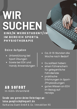 Wir suchen eine engagierte Person mit praktischer Erfahrung im Bereich Sport- bzw. physiotherapeutischer Übungen zur Unterstützung bei Trainings- und Bewegungsübungen.