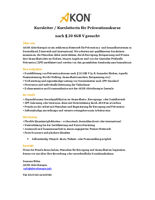 AKON Aktivtherapie ist ein erfahrenes Netzwerk für Präventions- und Gesundheitsreisen in Deutschland, Österreich und international. Wir arbeiten mit qualifizierten Kursleitern zusammen, die Menschen dabei unterstützen, durch Bewegung, Entspannung und Wissen ihre Gesundheit aktiv zu fördern. Unsere Angebote sind von der Zentralen Prüfstelle Prävention (ZPP) zertifiziert und werden von den gesetzlichen Krankenkassen bezuschusst.