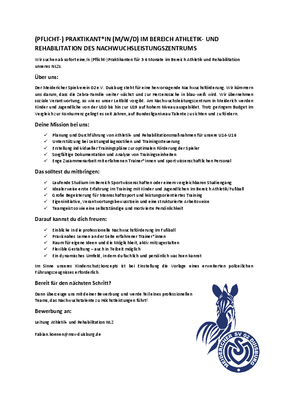 Wir suchen ab sofort eine/n (Pflicht-)Praktikanten für 3-6 Monate im Bereich Athletik und Rehabilitation unseres NLZs.
