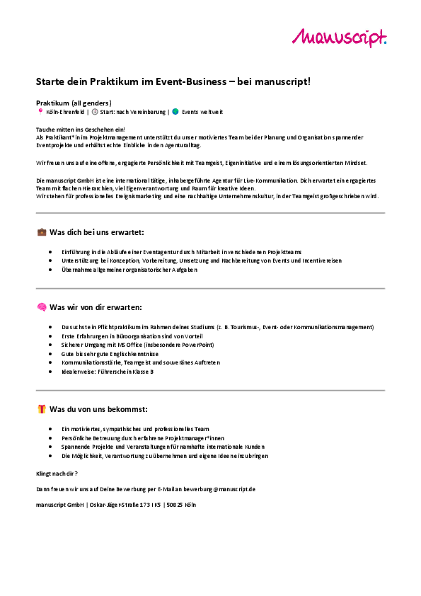 Die manuscript GmbH ist eine international tätige, inhabergeführte Agentur für Live-Kommunikation. Dich erwartet ein engagiertes Team mit flachen Hierarchien, viel Eigenverantwortung und Raum für kreative Ideen.