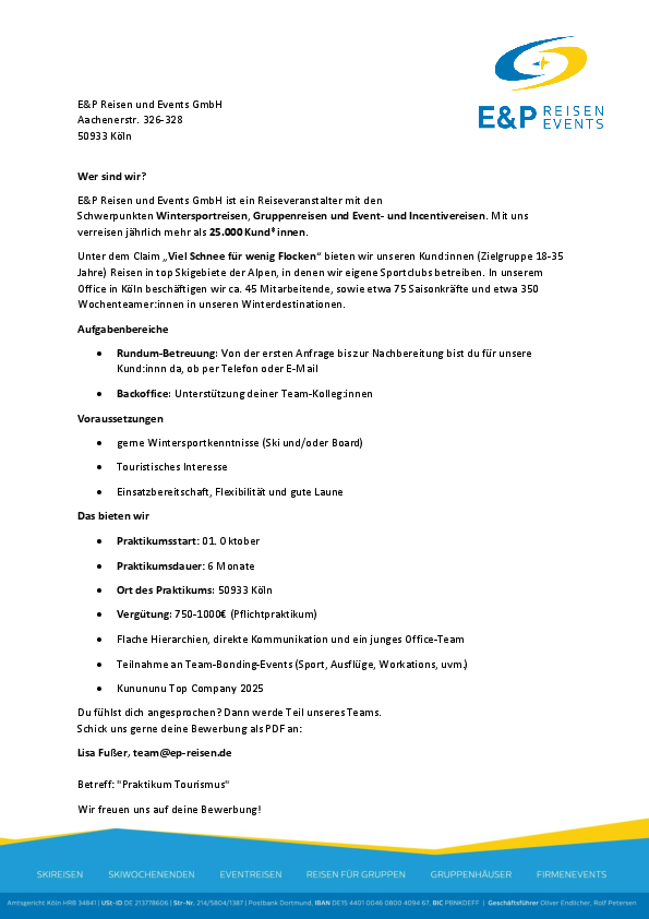 E&P Reisen und Events GmbH ist ein Reiseveranstalter mit den Schwerpunkten Wintersportreisen, Gruppenreisen und Event- und Incentivereisen. Mit uns verreisen jährlich mehr als 25.000 Kund*innen.