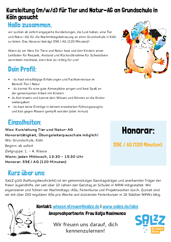 Wir suchen ab sofort engagierte Kursleitungen (m/w/d) für eine Tier und Natur-AG an einer Schule in Köln.