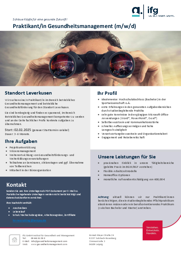 Wir suchen eine/n Praktikant/in im Bereich betriebliches Gesundheitsmanagement und betriebliche Gesundheitsförderung für den Standort Leverkusen.