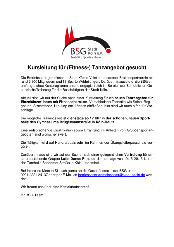 Bei Interesse können Sie sich gerne an die Geschäftsstelle der BSG unter +49 221 / 221 24137 oder per E-Mail an betriebssportgemeinschaft@stadt-koeln.de wenden.
