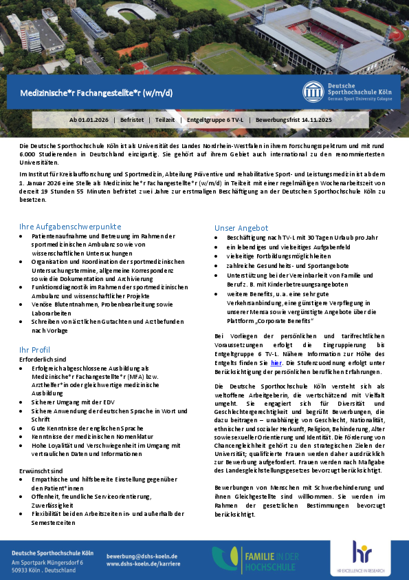 Im Institut für Kreislaufforschung und Sportmedizin, Abteilung Präventive und rehabilitative Sport- und Leistungsmedizin ist ab dem 1. Januar 2026 eine Stelle als Medizinische*r Fachangestellte*r (w/m/d) in Teilzeit mit einer regelmäßigen Wochenarbeitszeit von derzeit 19 Stunden 55 Minuten befristet zwei Jahre zur erstmaligen Beschäftigung an der Deutschen Sporthochschule Köln zu besetzen.