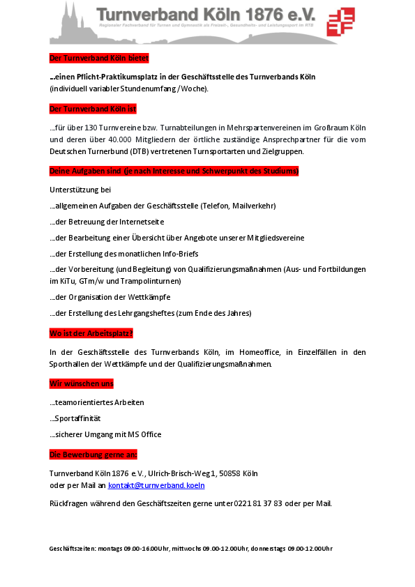 …einen Pflicht-Praktikumsplatz in der Geschäftsstelle des Turnverbands Köln. Der Start des Praktikums kann individuell abgestimmt werden, ebenso der wöchentliche Stundenumfang.