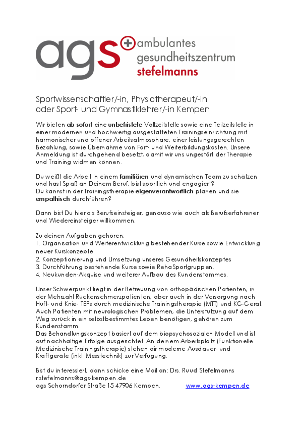 Gesucht Sportwissenschaftler/-in, Physiotherapeut/-in oder Sport- und Gymnastiklehrer/-in Kempen
