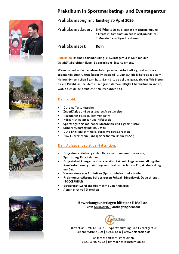 Bewerbungen bitte an timm.ulrich@4attention.de. Telefonische Rückfragen unter +49 221.56967612 (Timm Ulrich). Bei der Bewerbung unbedingt das mögliche Einstiegsdatum nennen und Infos zum Pflichtpraktikum.
