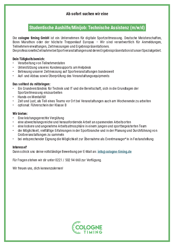 Dann schick uns deine vollständige Bewerbung per E-Mail an: info@cologne-timing.de