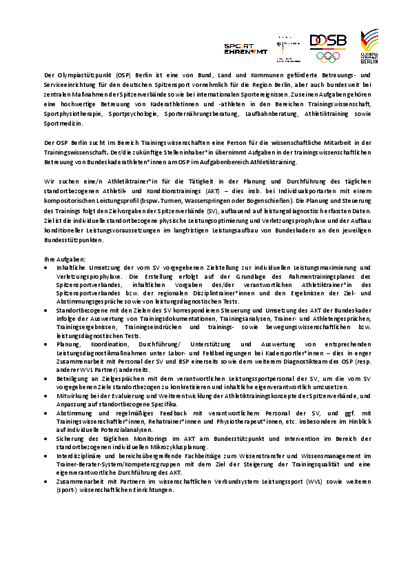 Der Olympiastützpunkt Berlin sucht einen Wissenschaftlichen Mitarbeiter (m/w/d) in der Trainingswissenschaft für den Bereich Athletiktraining. Nähere Informationen entnehmen Sie bitte der Stellenausschreibung.