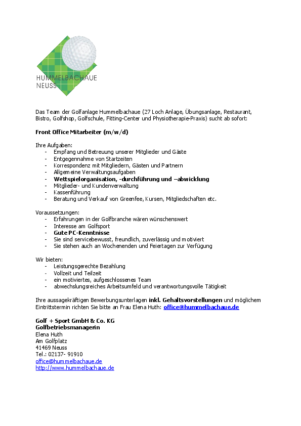 Das Team der Golfanlage Hummelbachaue (27 Loch Anlage, großzügige Übungsanlage, Restaurant, Bistro, Golfshop, Golfschule, Fitting-Center und Physiotherapie-Praxis) sucht zur Verstärkung ab sofort: