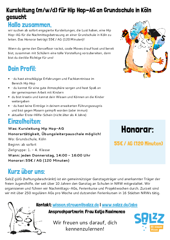 Wir suchen ab sofort engagierte Kursleitungen (m/w/d) für eine Hip Hop-AG an einer Schule in Köln.
