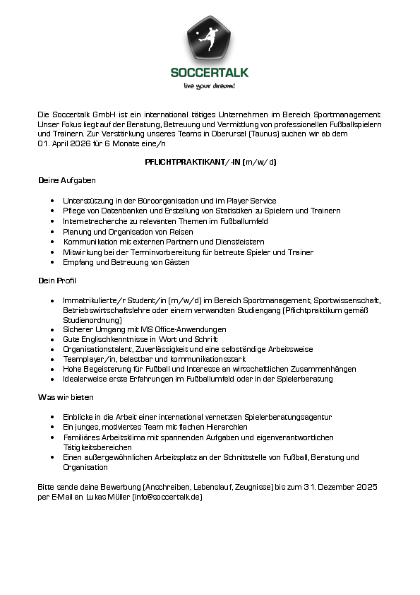 Die Soccertalk GmbH ist ein international tätiges Unternehmen im Bereich Sportmanagement. Unser Fokus liegt auf der Beratung, Betreuung und Vermittlung von professionellen Fußballspielern und Trainern. Zur Verstärkung unseres Teams in Oberursel (Taunus) suchen wir ab dem 01. April 2026 für 6 Monate eine/n