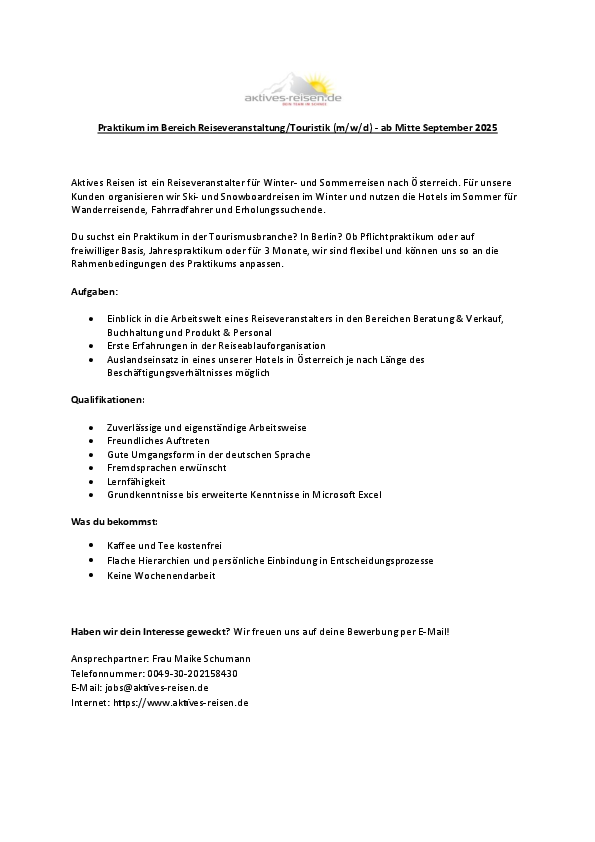 - Praktikum im Bereich Reiseveranstaltung und Touristik (m/w/d)