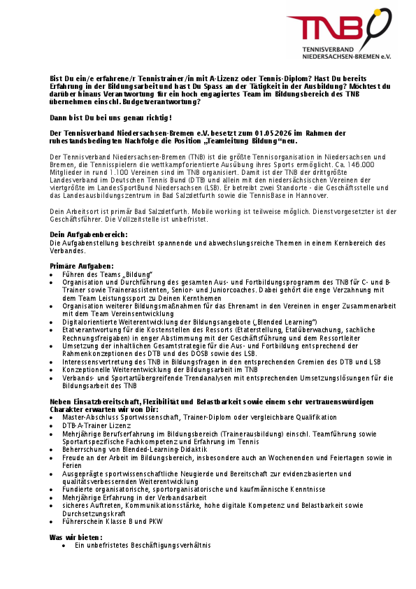 •Mehrjährige Berufserfahrung im Bildungsbereich (Trainerausbildung) einschl. Teamführung sowie Sportartspezifische Fachkompetenz und Erfahrung im Tennis