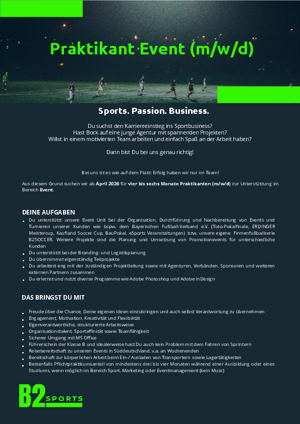 * Bestenfalls Pflichtpraktikumsanteil von mindestens drei bis vier Monaten während einer Ausbildung oder eines Studiums, wenn möglich im Bereich Sport, Marketing oder Eventmanagement (kein Muss)