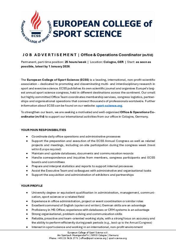 The European College of Sport Science (ECSS) is a leading, international, non-profit scientific association – dedicated to promoting and disseminating multi- and interdisciplinary research in sport and exercise science. ECSS publishes its own scientific journal and organises Europe’s largest annual sport science congress, held in different destinations across the continent. Our small but highly committed Office Team coordinates membership services, congress logistics, partnerships and organisational operations that connect thousands of professionals worldwide. Further information about ECSS can be found on our website: sport-science.org/home/.