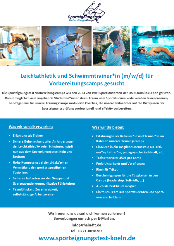 Für unsere Sporteigungstest Vorbereitungscamps suchen wir für die kommende Saison noch Verstärkung für das Trainerteam. Speziell im Leichtathletikbereich und im Schwimmbereich suchen wir kompetente Coaches, die Lust haben die Sportstudenten*innen von Morgen auf die Eignungsprüfung vorzubereiten: www.sporteignungstest-koeln.de