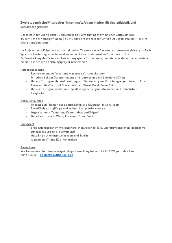 Das Institut für Sportdidaktik und Schulsport sucht zum nächstmöglichen Zeitpunkt zwei studentische Mitarbeiter*innen (je 8 Stunden pro Woche) zur Unterstützung im Projekt „ReLePro – Vielfalt im Schulsport“