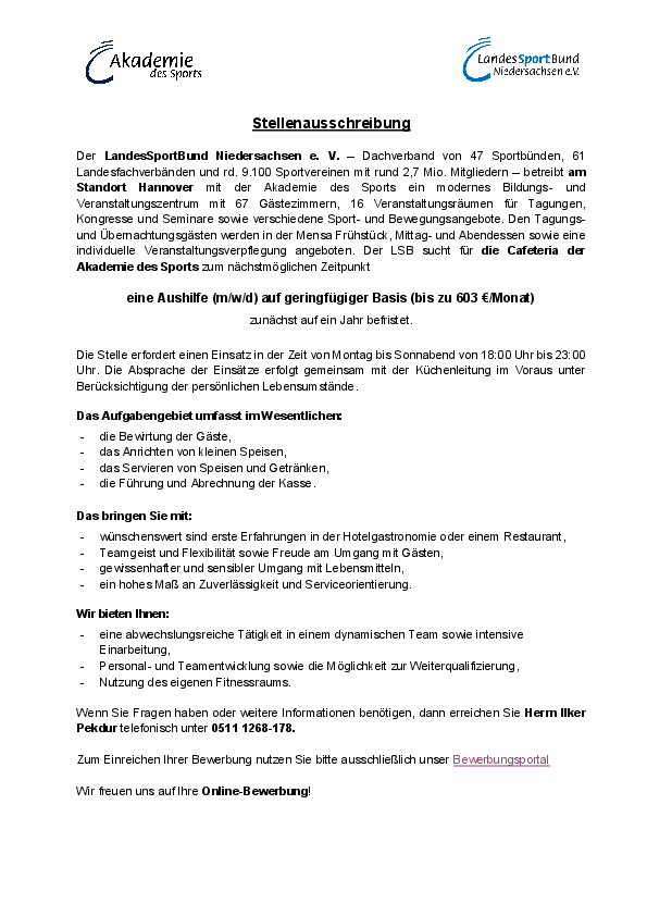 Der LandesSportBund Niedersachsen e. V. – Dachverband von 47 Sportbünden, 61 Landesfachverbänden und rd. 9.100 Sportvereinen mit rund 2,7 Mio. Mitgliedern – betreibt am Standort Hannover mit der Akademie des Sports ein modernes Bildungs- und Veranstaltungszentrum mit 67 Gästezimmern, 16 Veranstaltungsräumen für Tagungen, Kongresse und Seminare sowie verschiedene Sport- und Bewegungsangebote. Den Tagungs- und Übernachtungsgästen werden in der Mensa Frühstück, Mittag- und Abendessen sowie eine individuelle Veranstaltungsverpflegung angeboten. Der LSB sucht für die Cafeteria der Akademie des Sports zum nächstmöglichen Zeitpunkt