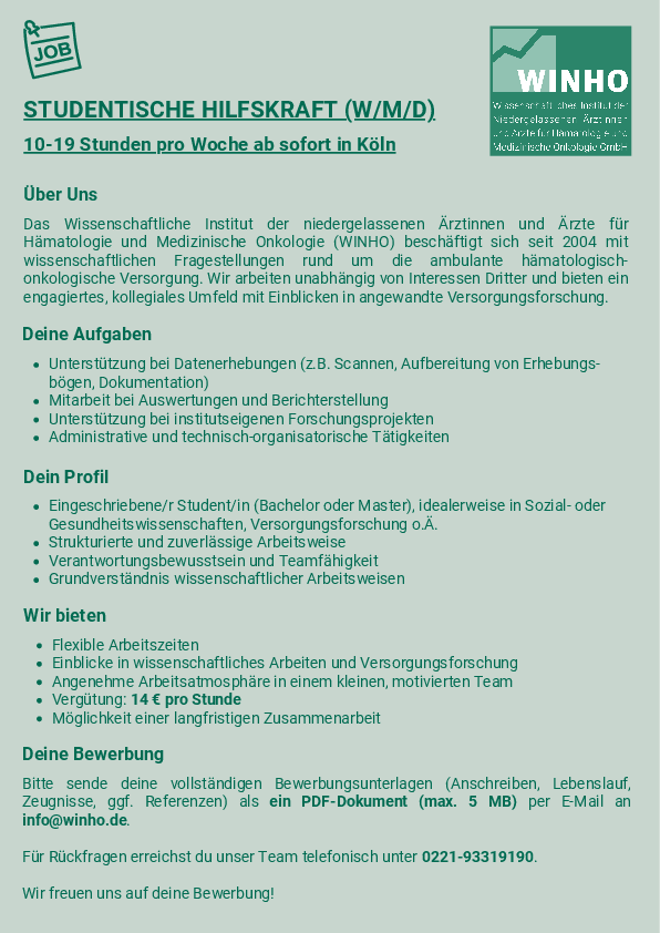 Das Wissenschaftliche Institut der Niedergelassenen Ärztinnen und Ärzte für Hämatologie und Medizinische Onkologie (WINHO) in Köln sucht zum nächstmöglichen Zeitpunkt eine Studentische Hilfskraft (m/w/d) in Teilzeit (10 bis 19 Stunden pro Woche) für die Mitarbeit und Unterstützung bei den anfallenden Arbeiten im Institut und seinen Projekten.