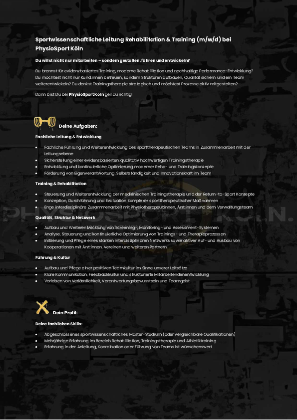 Sportwissenschaftliche Leitung Rehabilitation & Training (m/w/d) bei PhysioSport Köln