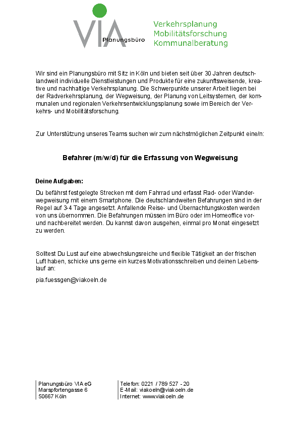 Du befährst festgelegte Strecken mit dem Fahrrad und erfasst Rad- oder Wanderwegweisung mit einem Smartphone. Die deutschlandweiten Befahrungen sind in der Regel auf 3-4 Tage angesetzt. Anfallende Reise- und Übernachtungskosten werden von uns übernommen. Die Befahrungen müssen im Büro oder im Homeoffice vor- und nachbereitet werden. Du kannst davon ausgehen, einmal pro Monat eingesetzt zu werden.