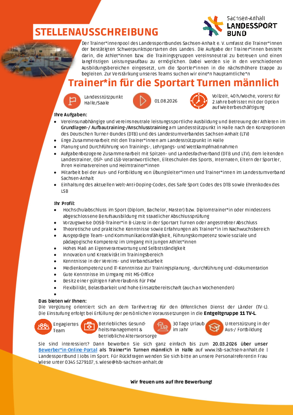 Der Landessportbund Sachsen-Anhalt sucht zum 01.08.2026 eine*n Trainer*in für die Sportart Turnen männlich am Landesstützpunkt in Halle (Saale).