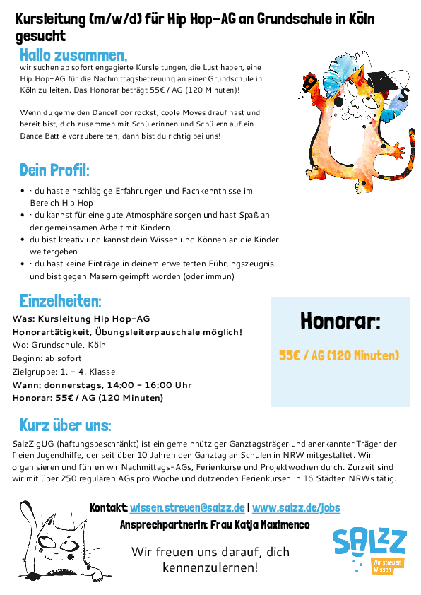 Wir suchen ab sofort engagierte Kursleitungen (m/w/d) für eine Hip Hop-AG an einer Schule in Köln.