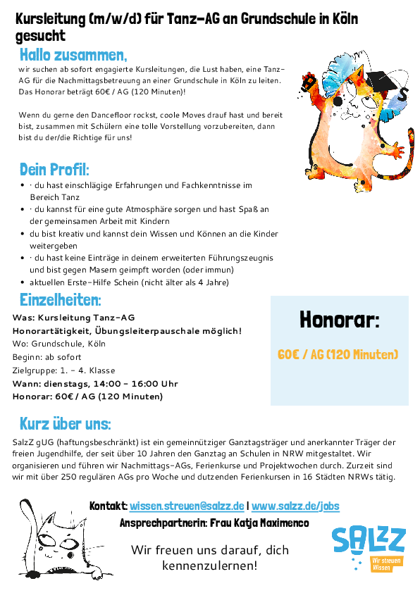 Wir suchen ab sofort engagierte Kursleitungen (m/w/d) für eine Tanz-AG an einer Schule in Köln.