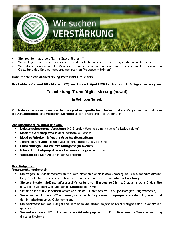 Der Fußball-Verband Mittelrhein (FVM) sucht zum 1. April 2026 für das Team IT & Digitalisierung eine