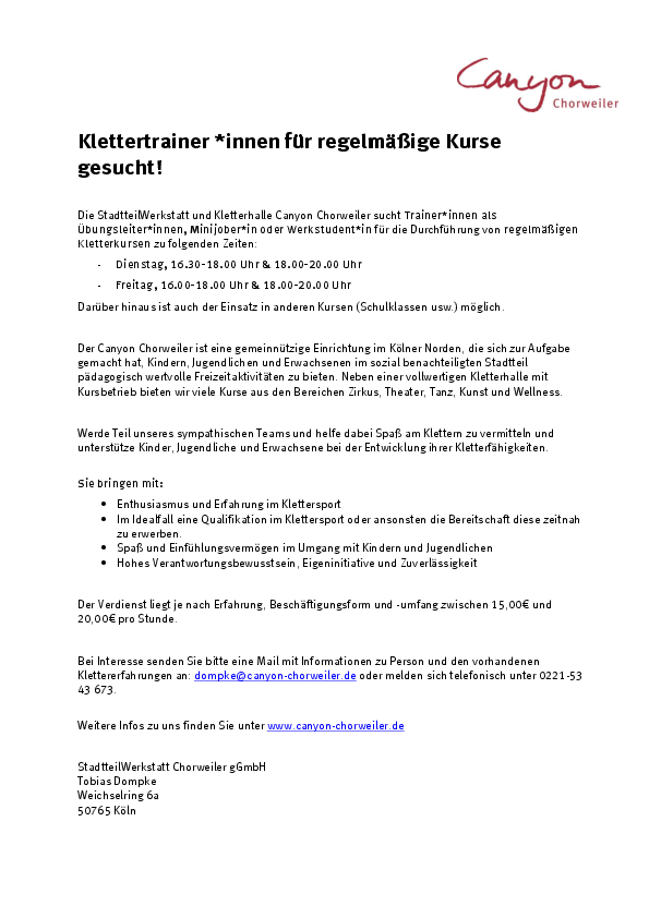 Die StadtteilWerkstatt und Kletterhalle Canyon Chorweiler sucht Trainer*innen als Übungsleiter*innen, Minijober*in oder Werkstudent*in für die Durchführung von regelmäßigen Kletterkursen zu folgenden Zeiten: