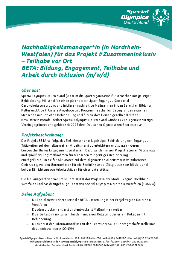 Die hier ausgeschriebene Stelle unterstützt das Projekt in der Modell-Region Nordrhein-Westfalen und das dazugehörige Team von Special Olympics Nordrhein-Westfalen (SONRW).