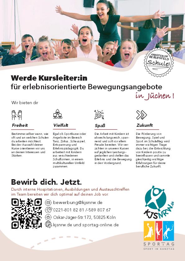 Du studierst Lehramt, Pädagogik oder Sport und suchst nach einem flexiblen Nebenjob mit attraktivem Honorar? Du wohnst in Jüchen oder Umgebung? Dann ließ gerne weiter!