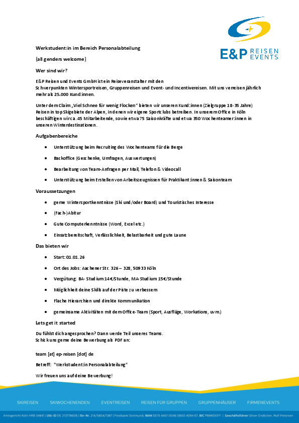 Unter dem Claim „Viel Schnee für wenig Flocken“ bieten wir unseren Kund:innen (Zielgruppe 18-35 Jahre) Reisen in top Skigebiete der Alpen, in denen wir eigene Sportclubs betreiben. In unserem Office in Köln beschäftigen wir ca. 45 Mitarbeitende, sowie etwa 75 Saisonkräfte und etwa 350 Wochenteamer:innen in unseren Winterdestinationen.